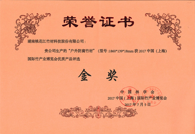 湖南桃花江竹材科技股份有限公司生產(chǎn)的戶外防腐竹地板在2017年7月中國(上海)國際竹產(chǎn)業(yè)博覽會中榮獲金獎(jiǎng),該獎(jiǎng)項(xiàng)由中國林學(xué)會、中國(上海)國際竹產(chǎn)業(yè)博覽會頒發(fā)。湖南桃花江竹材科技作為中國竹材領(lǐng)域高炭防腐技術(shù)的發(fā)明人,在中國竹材領(lǐng)域有著舉足輕重的地位。湖南桃花江竹材科技一直專注與于竹材的戶外運(yùn)用研發(fā)與創(chuàng)新,為全球客戶提供高品質(zhì)竹材。